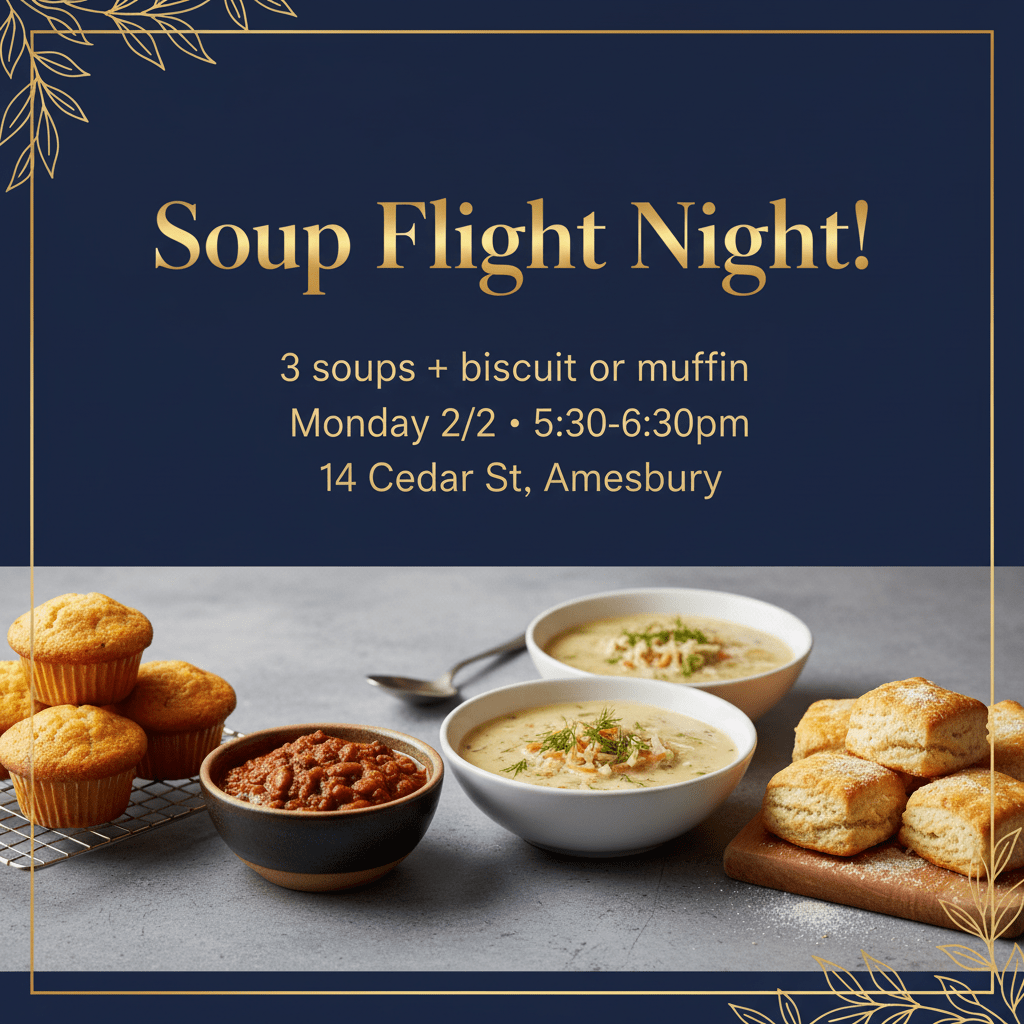- Rotating soups: A changing selection pulled from our weekly menu—think Tomato Basil Parmesan, Turkey Lasagna, or other small‑batch favorites that our regulars can’t stop requesting.